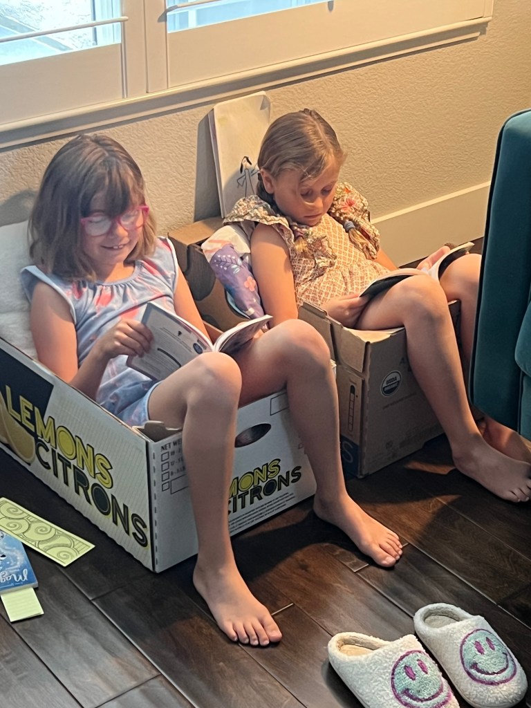 The next day, we rode bikes to the park, played in the pool, went to the library, and read books together. (Both girls have already finished a chapter book in one day, so I think we will need to go to the library again tomorrow!)